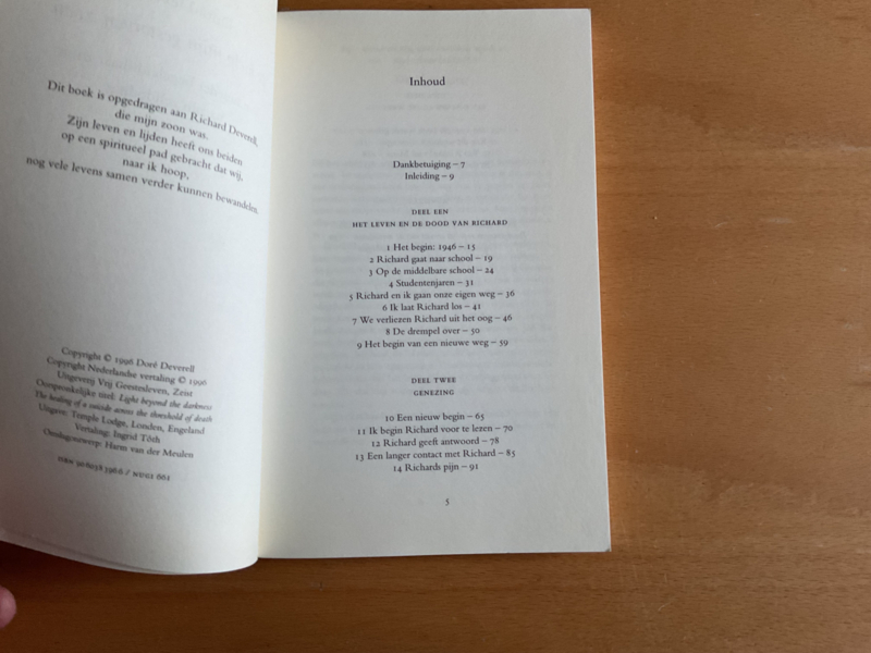 Doré Deverell doet in dit boek verslag van haar ervaringen na de dood van haar zoon Richard. Als Richard met 36 jaar een einde aan zijn leven maakt, laat hij zijn moeder ontredderd en vol vragen achter. Door tips van vrienden, door de bestudering van esoterische literatuur, maar vooral door haar liefde en doorzettingsvermogen slaagt zij erin, over de grens van de dood heen contact met Richard te krijgen. Daarbij wordt duidelijk welke zware weg iemand na een zelfdoding gaat en hoe je hem of haar daarbij kunt bijstaan.