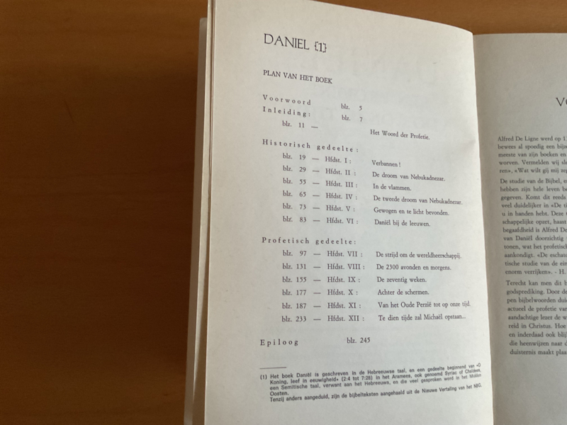 OverzichtHet boek Daniël, een profeet voor onze tijd, geschreven door Alfred de Ligne en uitgegeven in 1975 door "Tekenen des tijds", is een theologische uiteenzetting die het Bijbelse boek Daniël toepast op de moderne tijd. De Ligne benadert de profeet Daniël als een relevante figuur wiens visioenen over de "eindtijd" en Gods soevereiniteit inzicht bieden in actuele wereldgebeurtenissen.