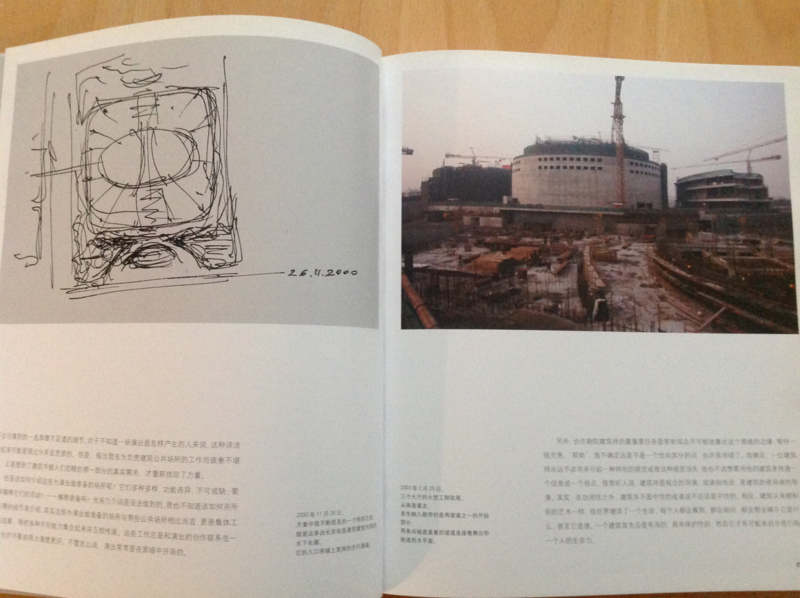 OverzichtGroot-formaat fotoboek over het National Grand Theatre, het Nationaal Centrum voor Uitvoerende Kunsten, het operagebouw van de Chinese hoofdstad Peking. Het elipsvormige gebouw is 46 meter hoog, en gedeeltelijk van glas. Het gebouw wordt weerspiegeld in een vijver rondom.