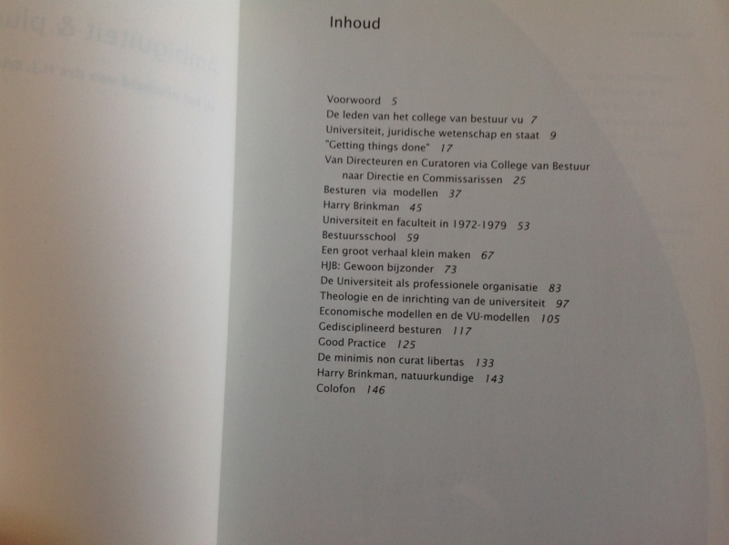 OverzichtNaar aanleiding van het afscheid van drs. Harry J. Brinkman als bestuursvoorzitter van de Vrije Universiteit van Amsterdam, vonden 16 (oud)-collegae het een goed idee om ieder vanuit hun eigen wetenschappelijke discipline, resp. de eigen opvatting daarover het universitair bestuur bij gelegenheid van dit afscheid nog eens tegen het licht te houden.