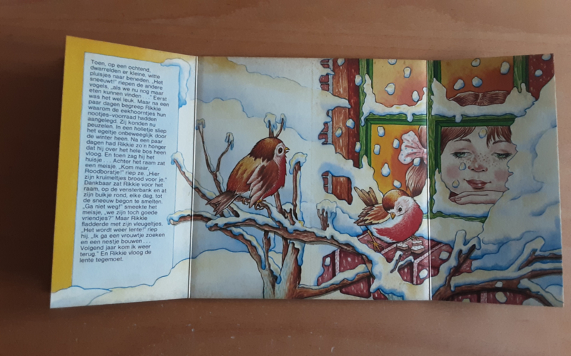 OverzichtPrentenboek, openklapboekje -met dikke bladzijden- waarin een jong roodborstje de wisseling van de seizoenen beleeft.