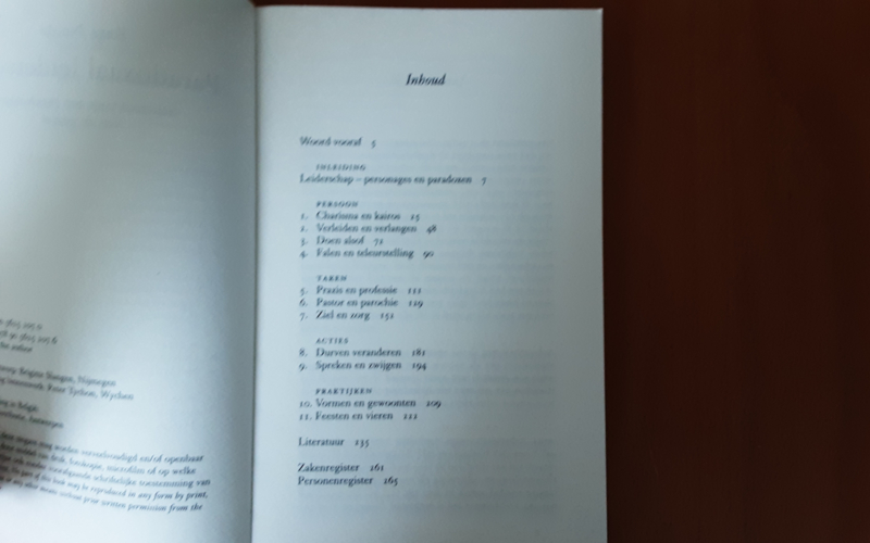 Hoe kan de pastor in dit alles durven veranderen en toch zichzelf niet verliezen? Hoe onderscheidt hij zich van andere professionals, van andere hulpverleners, van andere theologen? Hoe oprecht moet hij of zij zijn in het vervullen van de rol van religieuze leider? Vraagt het ambt soms niet om doen alsof, om spel en tegenspel, om de juiste balans tussen spreken f zwijgen? Welke bijdrage levert de pastor aan het voort-bestaan van de gemeenschap waaraan hij leiding geeft? Die bijdrage bestaat vooral uit ruzie maken, het durven aangaan van conflicten die noodzakelijk zijn voor de voortdurende aanpassing aan veranderende omstandigheden en nieuwe communiteiten. Dat maakt de pastor ook kwetsbaar; hij is afhankelijk van degenen die kunnen en willen volgen. Hoe kan zijn weerbaarheid tegen teleurstelling vergroot worden?.
