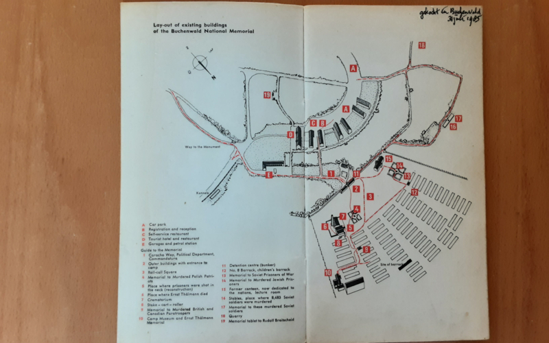 OverzichtFotoboekje met 40 foto's over Buchenwald, inclusief 2 plattegronden kamp Buchenwald, met nummeraanduiding waar wat zich bevindt, en andere informatie.