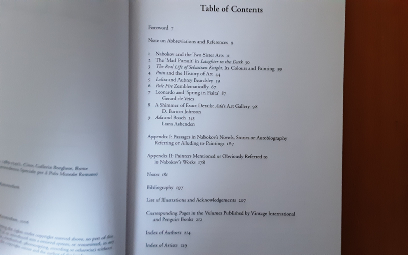 Naast een uitgebreide inleiding waarin de vele relaties worden beschreven die Nabokov aanbracht tussen de literaire en visuele kunsten wordt en detail ingegaan op diverse romans: Een lach in het donker, Het werkelijke leven van Sebastian Knight, Pnin, Lolita, Bleek vuur, en Ada. Een hoofdstuk is geheel gewijd aan Leonardo da Vinci, een ander aan Jeroen Bosch, beiden schilders waar Nabokov een bijzondere waardering voor had. De auteurs laten zien hoe de picturale connotaties een extra diepte geven aan de grote thema's in Nabokov's oeuvre; liefde en verlies. Opmerkelijk is ook hoe deze referenties juist ethische aspecten in zijn werk accentueren, kanten die lange tijd onderbelicht zijn gebleven. Esthetiek en ethiek vormen bij Nabokov zo'n harmonische verbinding dat de afzonderlijke componenten niet gemakkelijk herkenbaar zijn. Deze studie vormt de eerste publicatie in boekvorm over dit onderwerp.