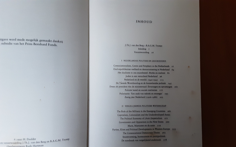 In het eerste deel treft men onder meer artikelen aan als 'Nederland en de wereld: 1940-1945', 'loden in een verzullend Nederland', 'De Tweede Wereldoorlog en de binnenlandse geactualiseerde versie van het klassieke 'The Netherlands: Opposition in a Segmented Society'.