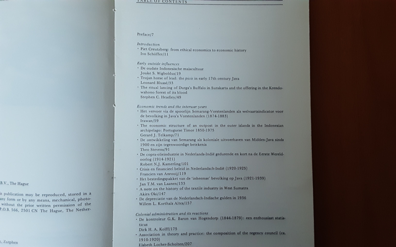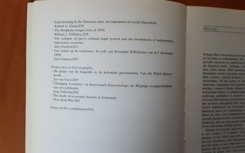 Perhaps Piet Creutzberg is and essentially always has been an artisan and an admirer of the best in craftmanship. The emphasis on the practical side of things seems to pervade whatever he undertook during half a century. Anyway, it is as a trader of the historical craft - wielding a Chinese abacus or an electronic computing devic- that, from about 1965 onwards, an increasing number of younger students of Indonesian social, economic and political history have met him in the depot of the 20th century colonial archives in The Hague or at the Royal Tropical Institute in Amsterdam. Of the scores of Dutch, Indonesian, British, Scandinavian, German, American, Australian and Japanese historians he inspired and advised some were writing a master's thesis, others had already made part of their academic career in Indonesian history or related topics, but most of them were in the critical phases of collecting published or archival materials with a view to their incorporation in doctoral dissertations.