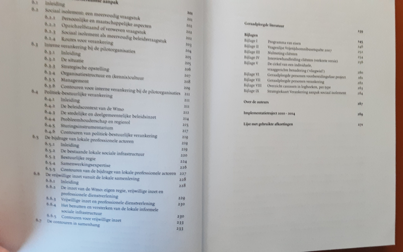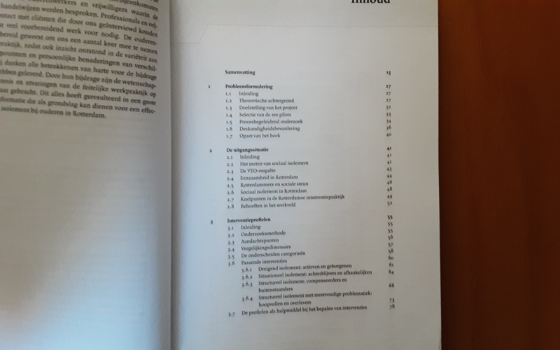 Dit boek beschrijft alle aspecten van de ontwikkelde aanpak. Het biedt achtergrondinformatie over sociaal isolement en inzicht in de heterogeniteit van de doelgroep. Het laat zien welke mogelijkheden er zijn om sociaal isolement bij ouderen aan te pakken, welke resultaten kunnen worden verwacht bij verschillende categorieën sociaal geïsoleerden, welke organisatorische en institutionele randvoorwaarden nodig zijn om de aanpak succesvol in te kunnen voeren en hoe verankering van de ontwikkelde werkwijzen in de reguliere uitvoeringspraktijk kan plaatsvinden.