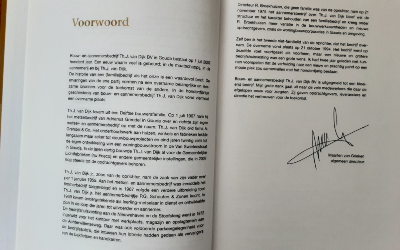 OverzichtHet boek werd uitgegeven ter gelegenheid van het 100-jarig bestaan van Bouw- en aannemingsbedrijf Th.J. van Dijk BV.